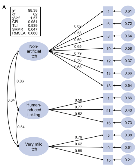 共有370名受试者参与测试并纳入探索性因子分析。结果显示,最终ISQ共有13个条目,解释方差为63.68%。ISQ量表呈现出清晰的3因子结构,所有条目在其对应的因子上载荷均高于0.5,无跨因子负荷。三个因子被分别命名为非人为诱发痒(7个条目,解释方差为45.31%)、人为诱发痒(3个条目,解释方差为9.87%)、极轻微瘙痒(3个条目,解释方差为8.51%)。验证性因子分析共纳入了165名受试者,评估了ISQ的3因子模型拟合优度。分析结果显示模型拟合效果非常理想,所有指标均符合建议阈值。