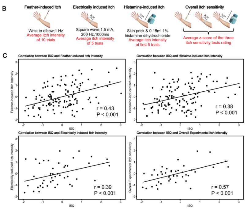 为验证ISQ量表的有效性,研究者招募了124名健康参与者,要求他们完成了一系列问卷并接受了一系列实验性痒觉敏感性测试,包括三种类型的痒觉诱发刺激:羽毛刺激、电刺激、组胺二盐酸溶液点刺。在每项测试中,受试者均使用11分制数字评分量表 (NRS) 对瘙痒强度进行评分。检验结果表明,ISQ总分与总体实验室诱发痒觉敏感性呈显著相关(r = 0.57, P < 0.001),且该相关性也体现在所有测试中。